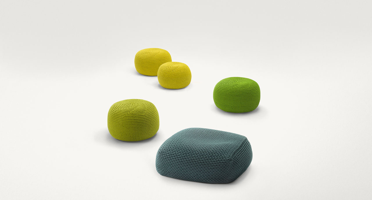 Rivestimento esterno: fisso per il cuscino, sfoderabile per i pouf, realizzato all’uncinetto con una corda in filato Rope.