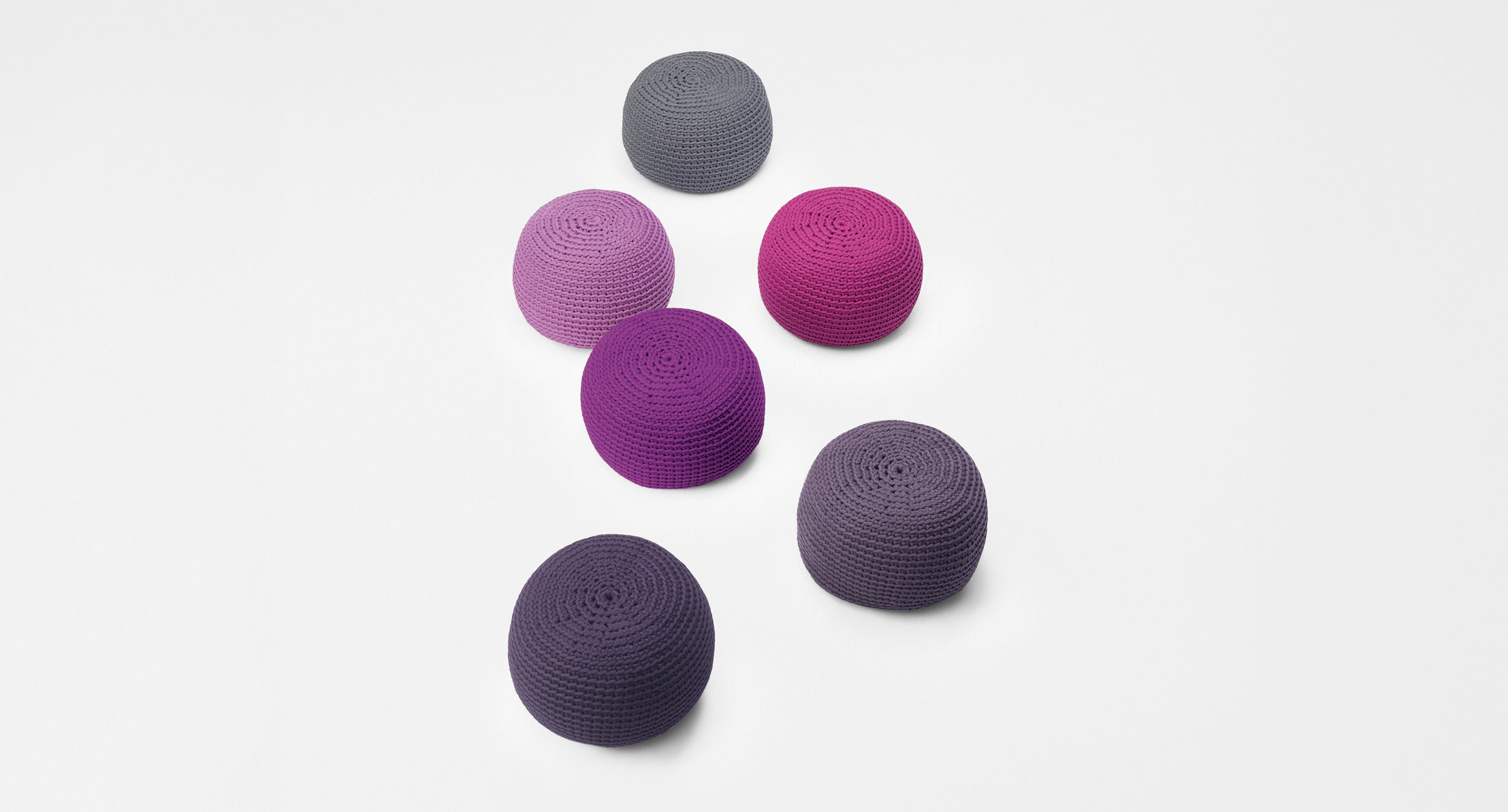 Serie composta da pouf e cuscino con rivestimento realizzato a mano all’uncinetto.