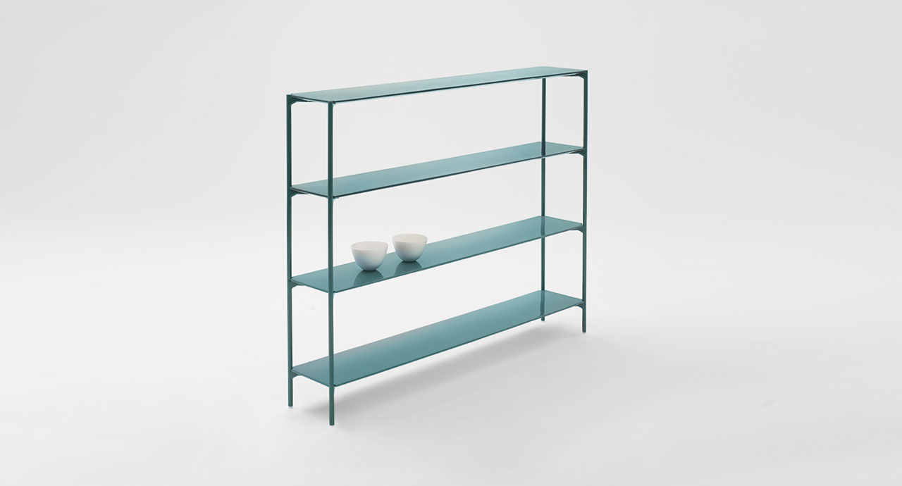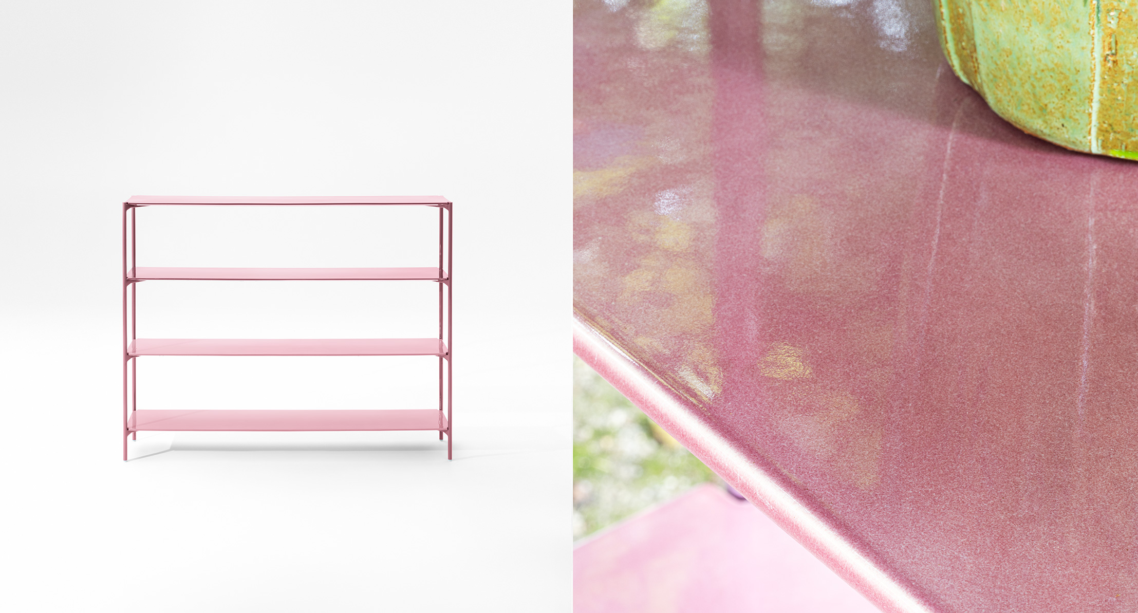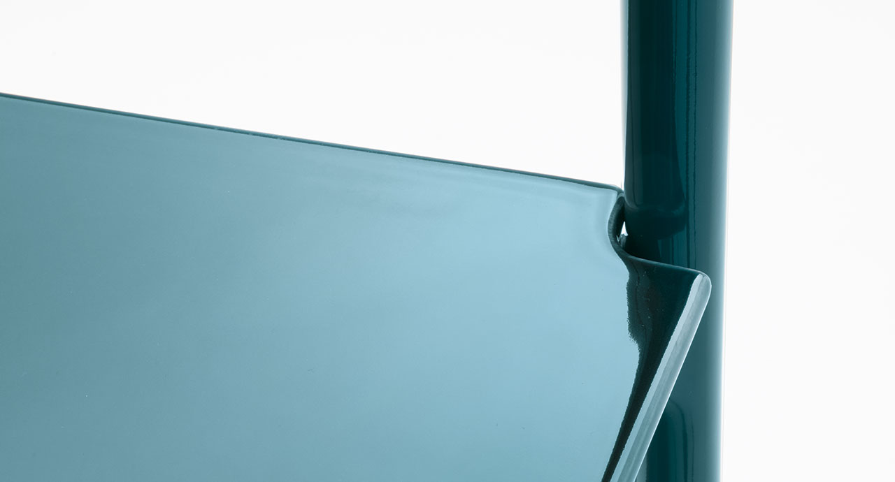Base: acciaio trattato con cataforesi e verniciato lucido in colore abbinato a quello dei ripiani. Puntali in materiale plastico.