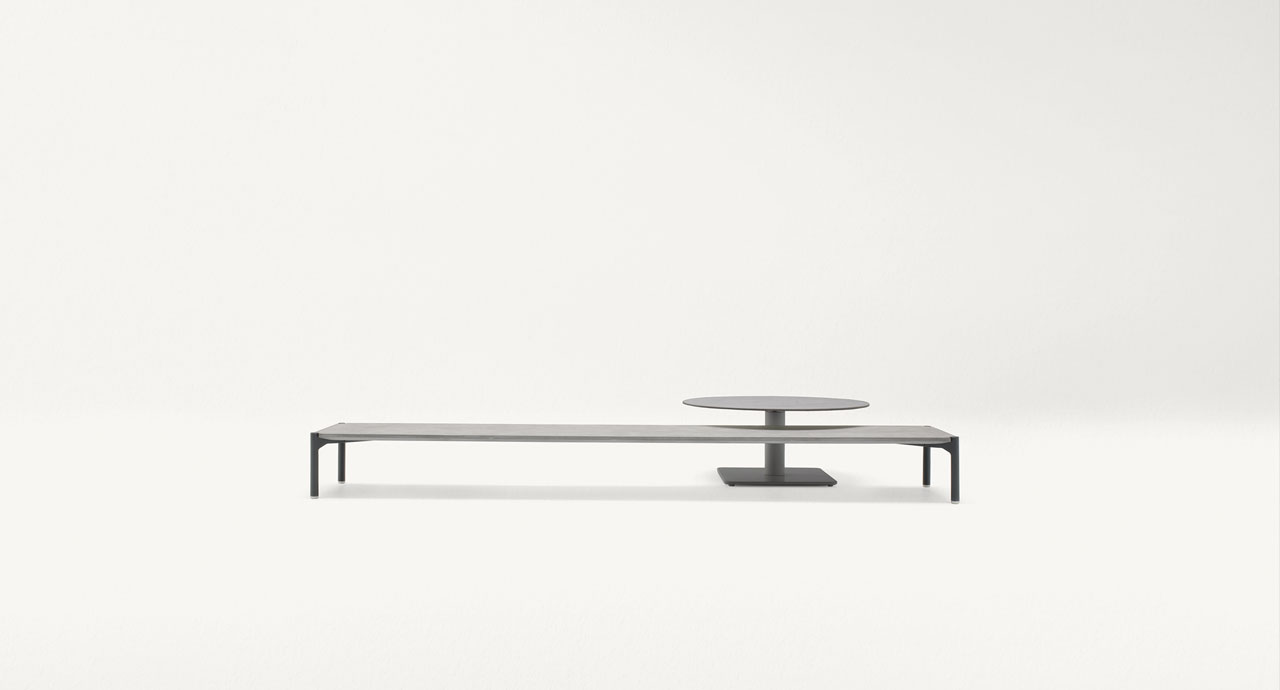Piano: cemento alleggerito nei colori avorio o grafite abbinato al colore della base.