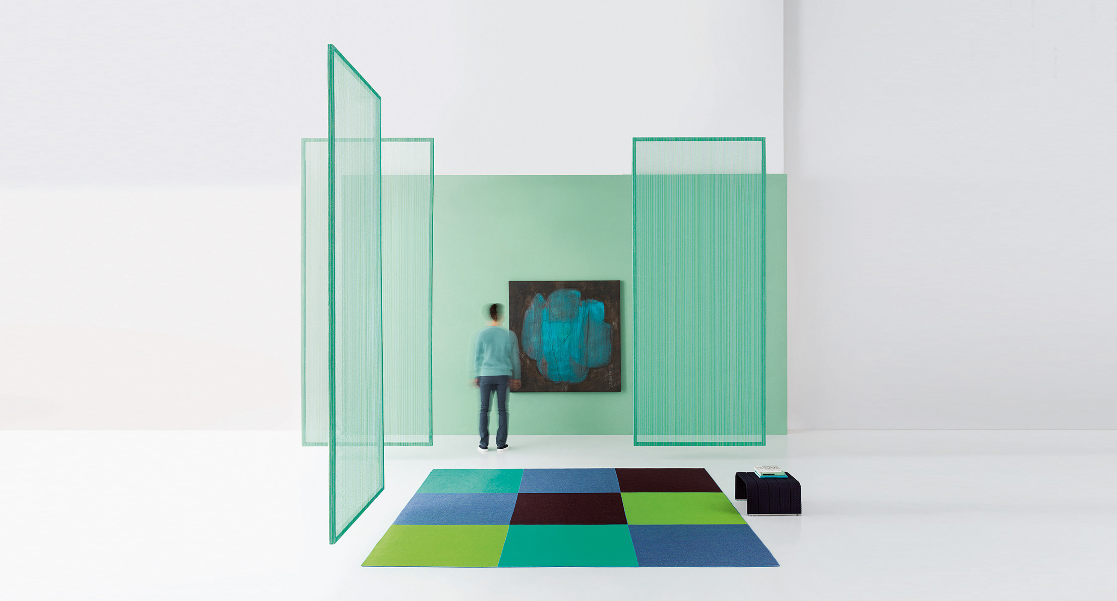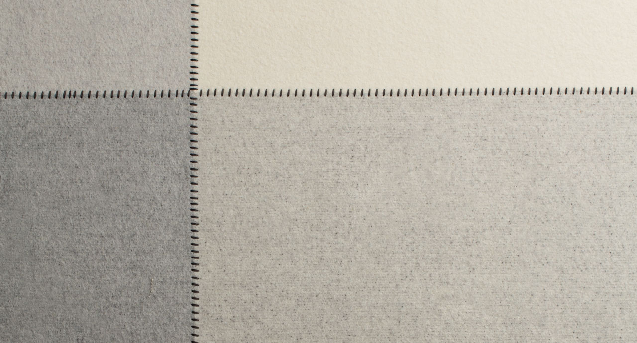 Quadri è un tappeto in feltro realizzato dall’unione di elementi cuciti a punto Cavallo.