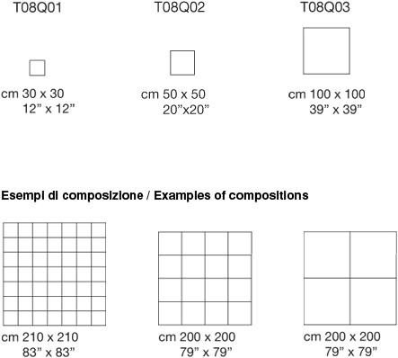 La superficie del tappeto è composta da quadrati disponibili in tre diverse dimensioni: cm 30 x 30, cm 50 x 50 e cm 100 x 100.