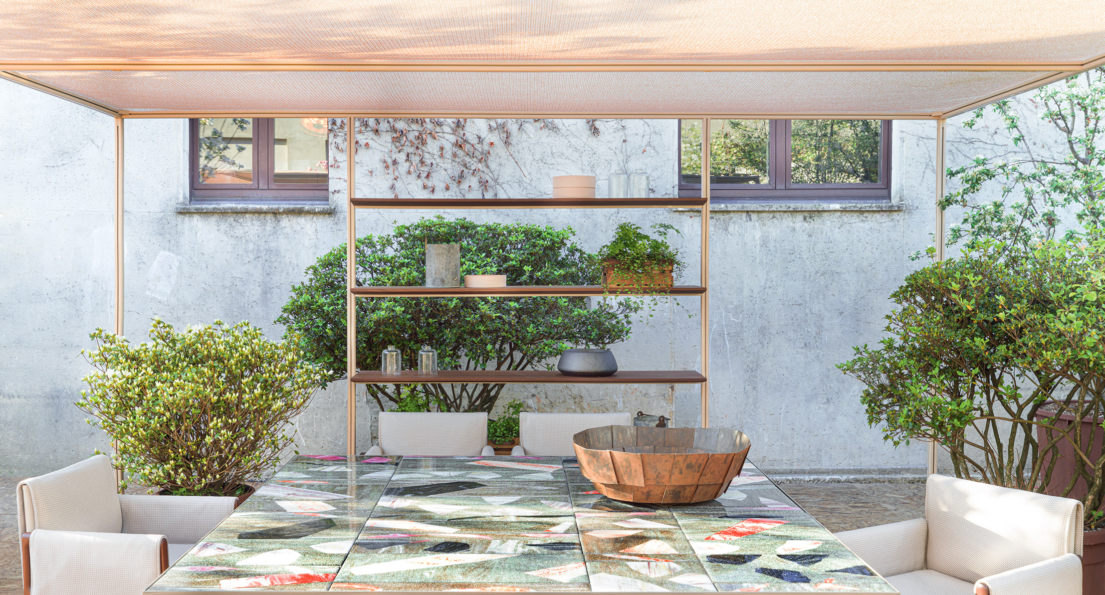 Resort è una struttura architettonica flessibile e modulare che può essere usata sia come un ampio parasole sia per creare percorsi coperti articolati.