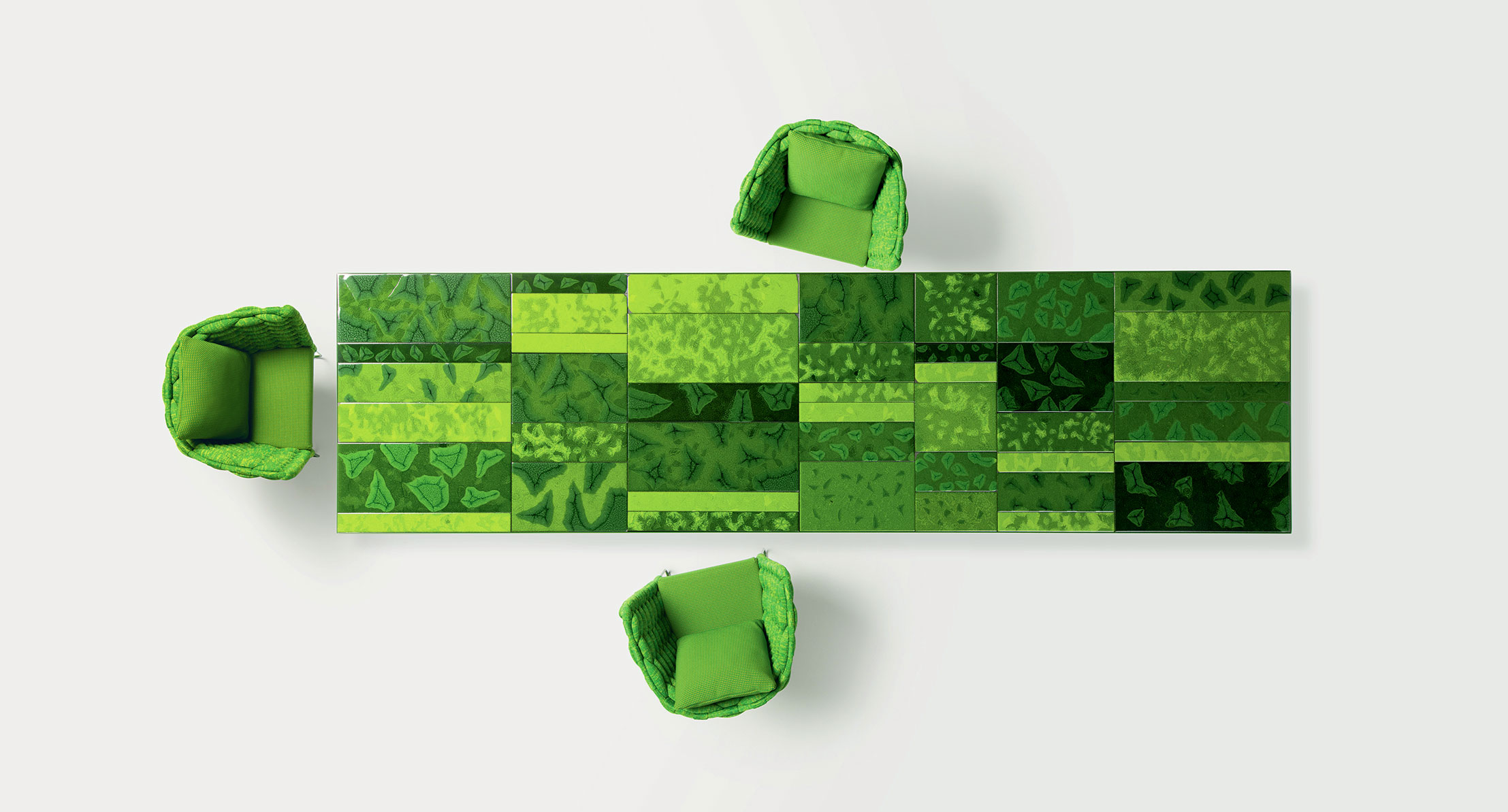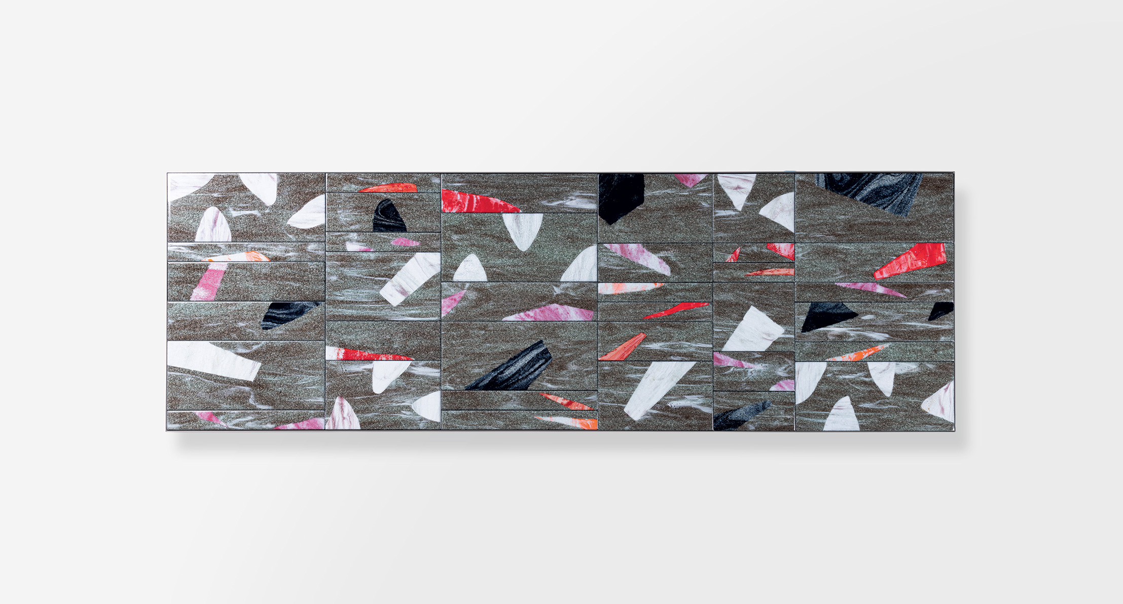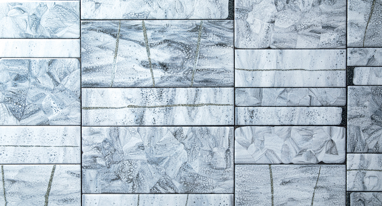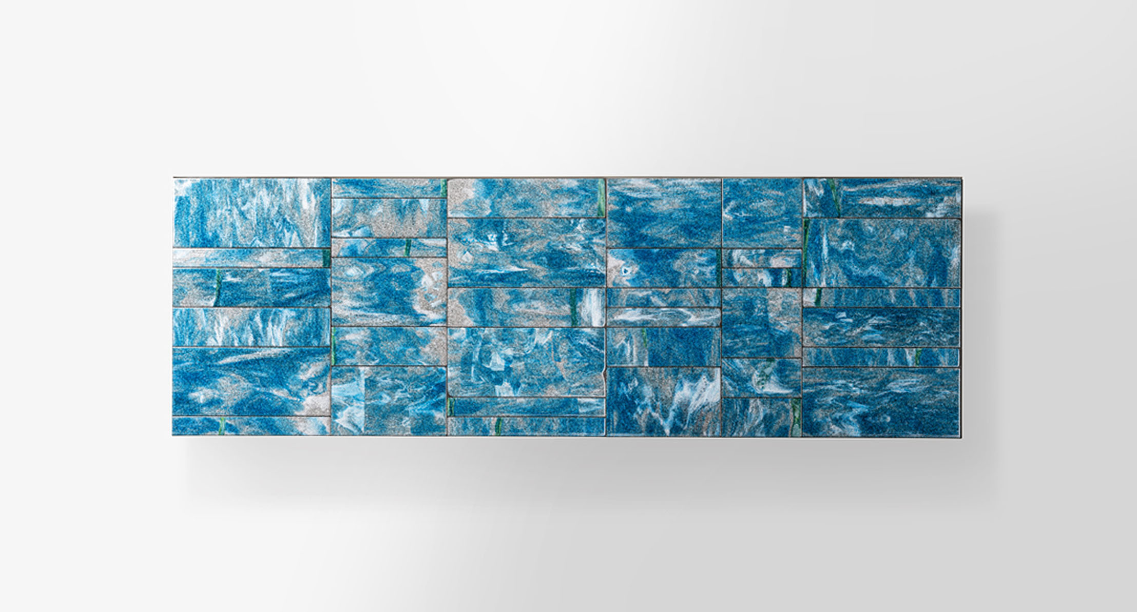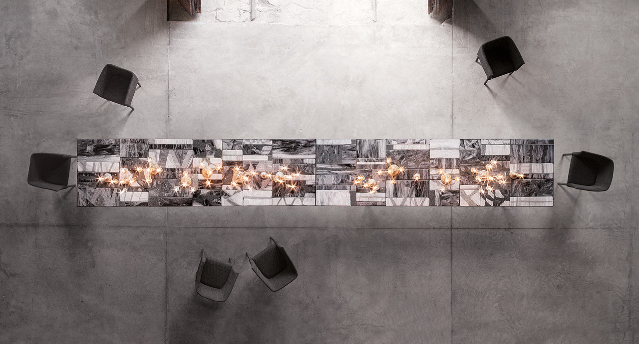 La decorazione del piano è realizzata a mano e rende unico ogni singolo pezzo. Il materiale, il particolare tipo di lavorazione e la tecnica usata per la produzione creano elementi dal disegno diverso, che a loro volta compongono piani differenti anche della stessa partita. L’irregolarità è la caratteristica distintiva di questa lavorazione.
