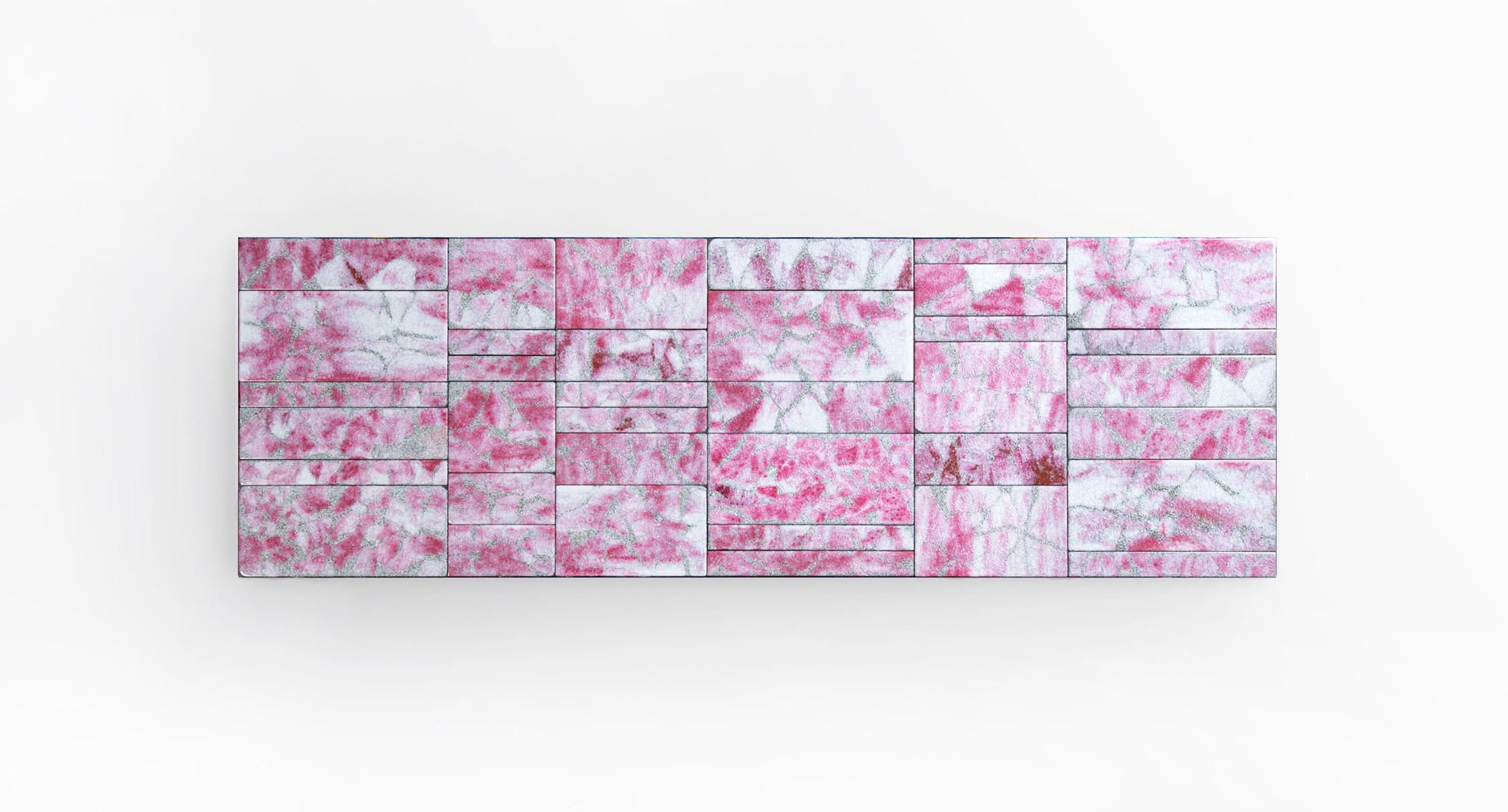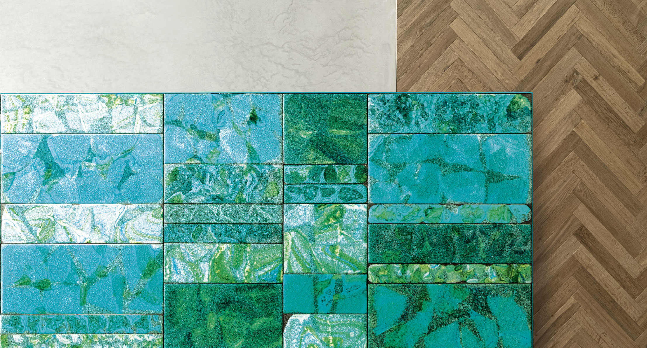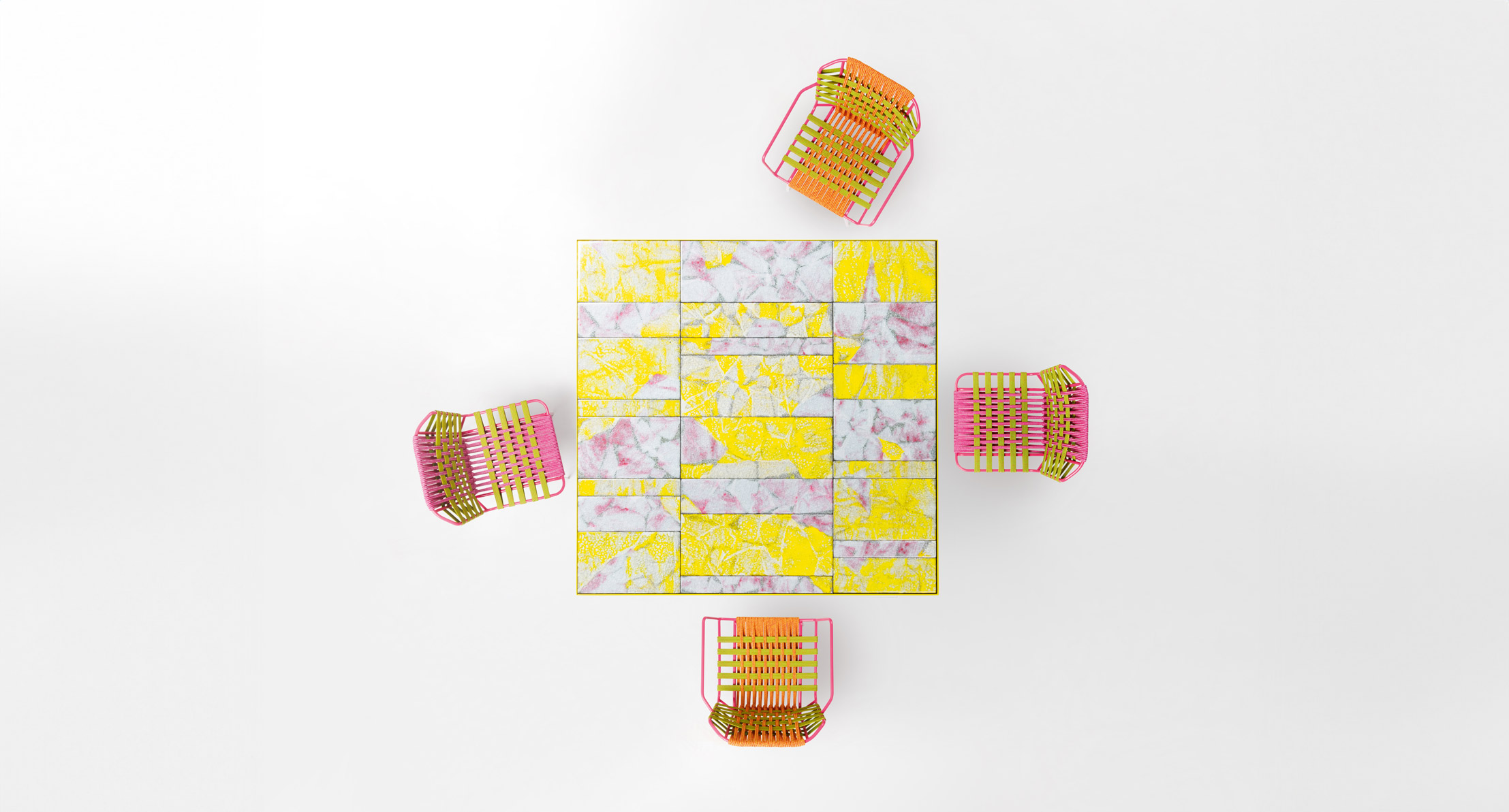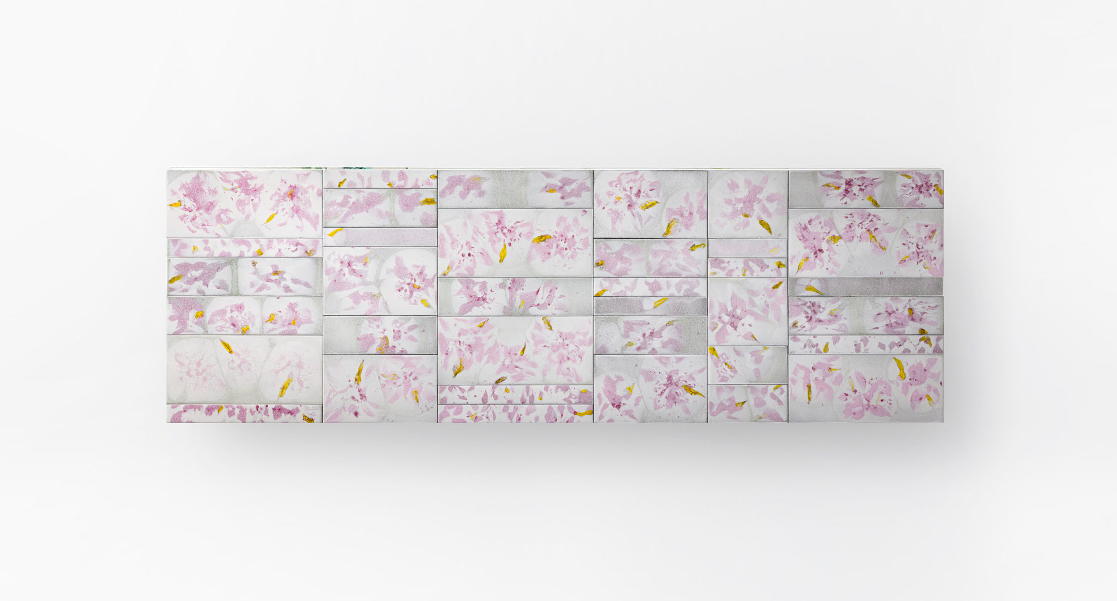 La decorazione del piano è realizzata a mano e rende unico ogni singolo pezzo. Il materiale, il particolare tipo di lavorazione e la tecnica usata per la produzione creano elementi dal disegno diverso, che a loro volta compongono piani differenti anche della stessa partita. L’irregolarità è la caratteristica distintiva di questa lavorazione.