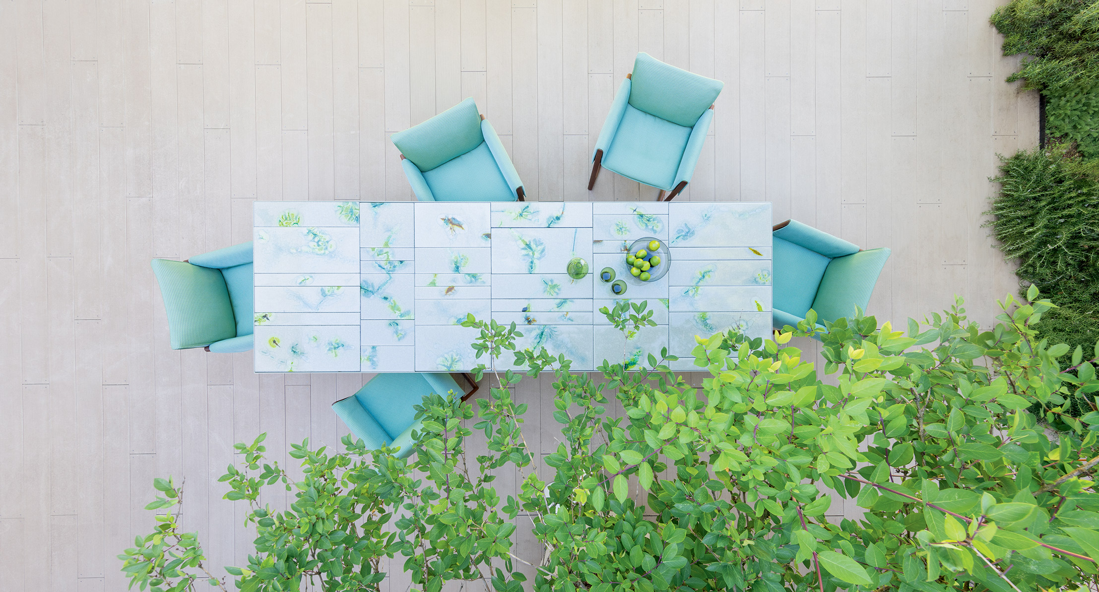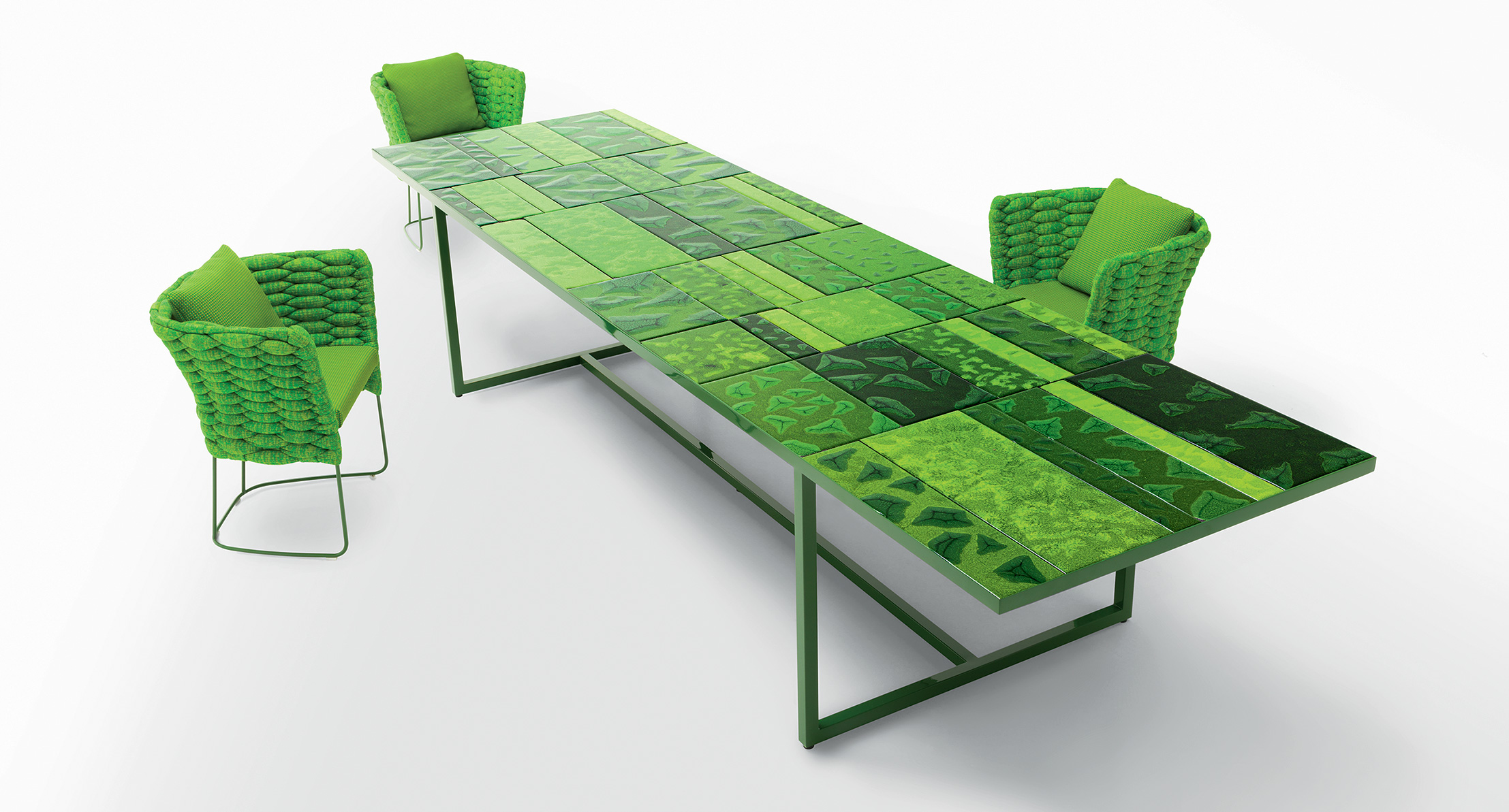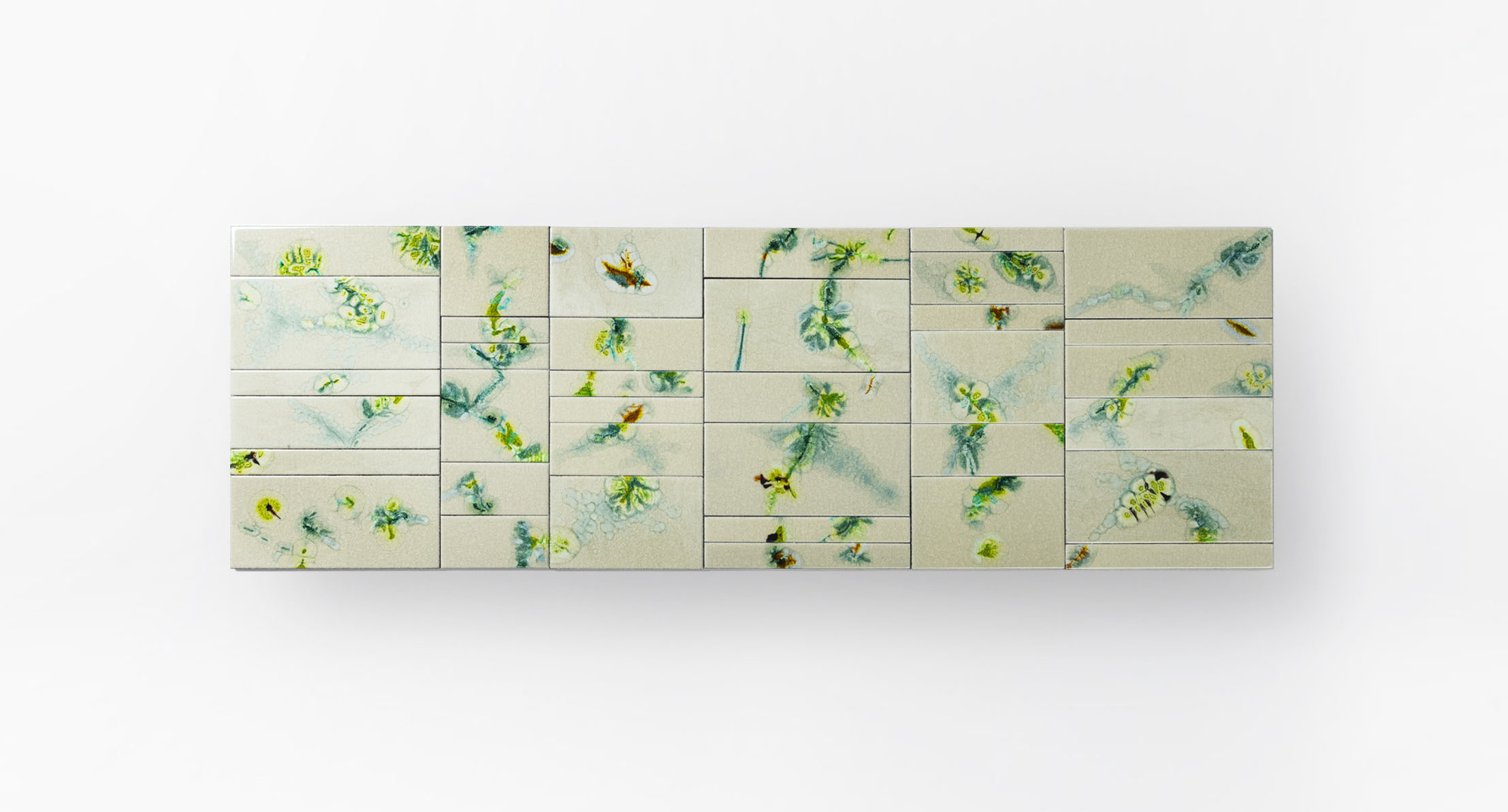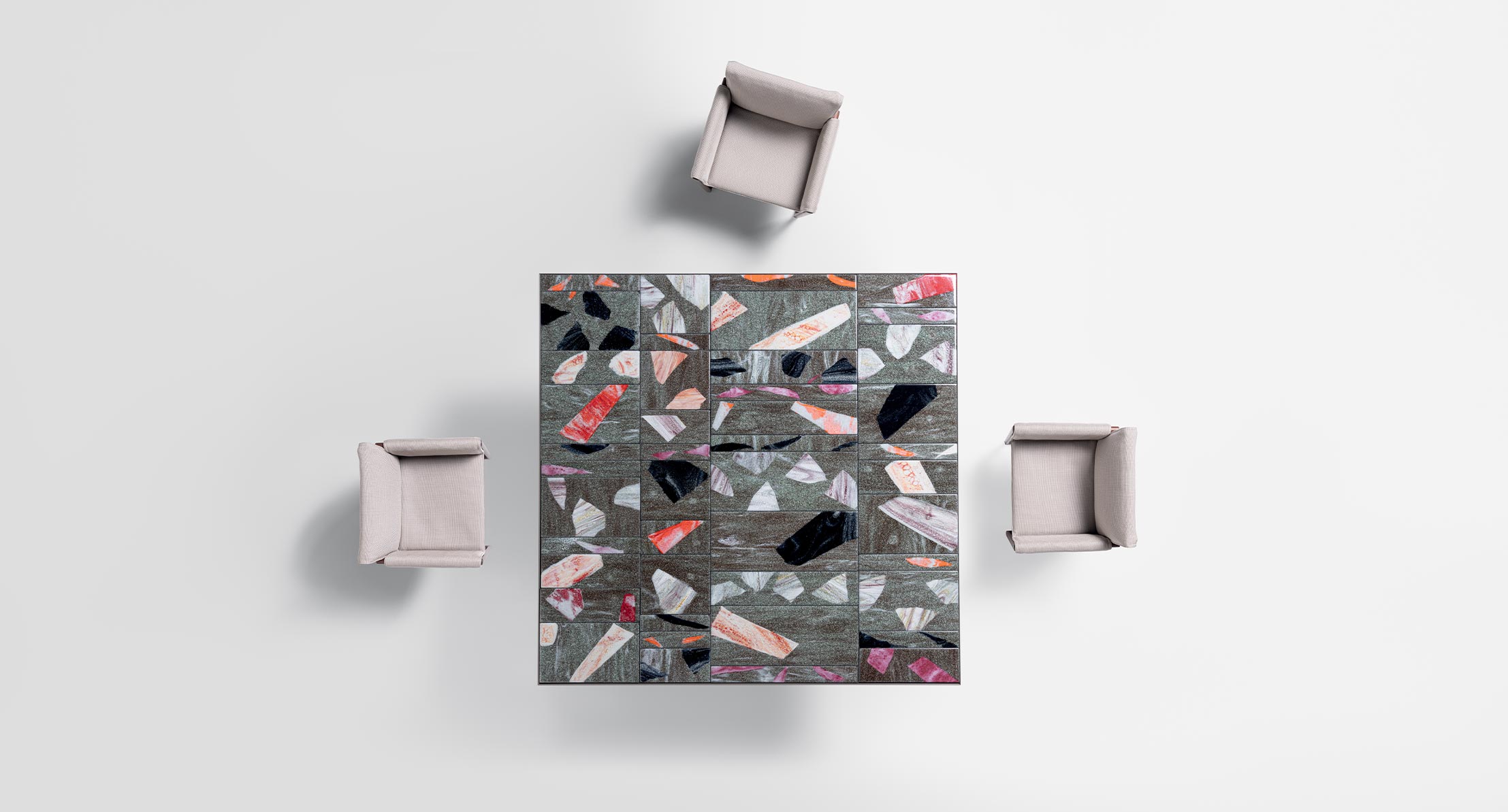 La decorazione del piano è realizzata a mano e rende unico ogni singolo pezzo. Il materiale, il particolare tipo di lavorazione e la tecnica usata per la produzione creano elementi dal disegno diverso, che a loro volta compongono piani differenti anche della stessa partita. L’irregolarità è la caratteristica distintiva di questa lavorazione.