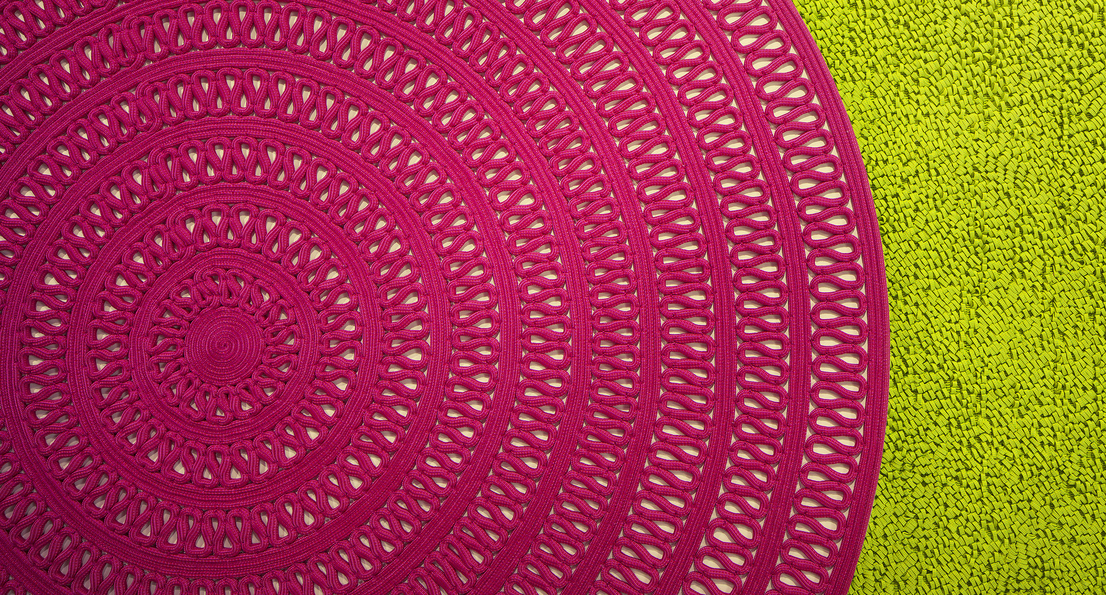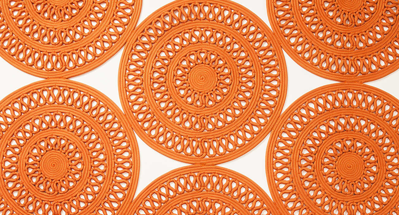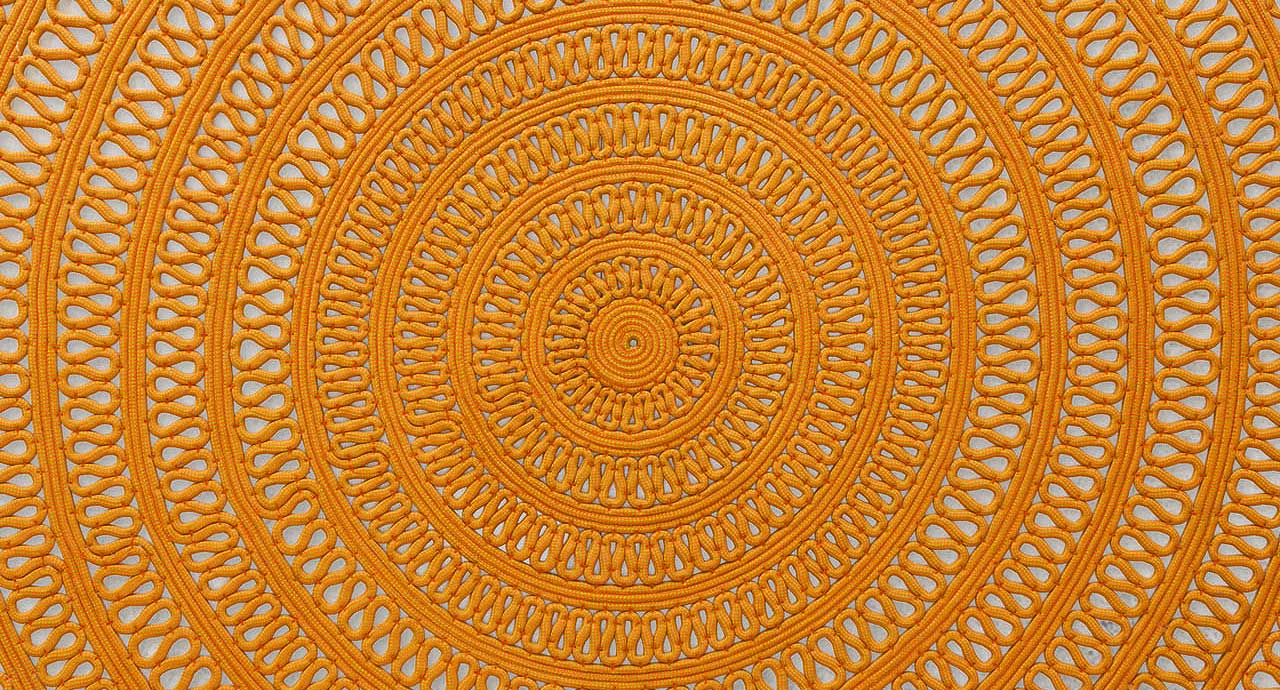 Il tappeto è realizzato dall’unione di moduli tondi decorati cuciti in modo da ottenere una sequenza geometrica alternata.