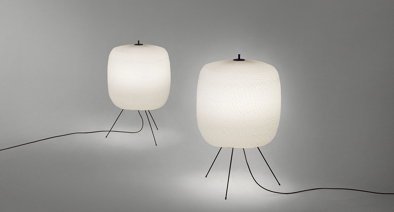 Serie di lampade da terra realizzate cucendo a spirale una corda opalina in poliestere resistente agli agenti atmosferici.