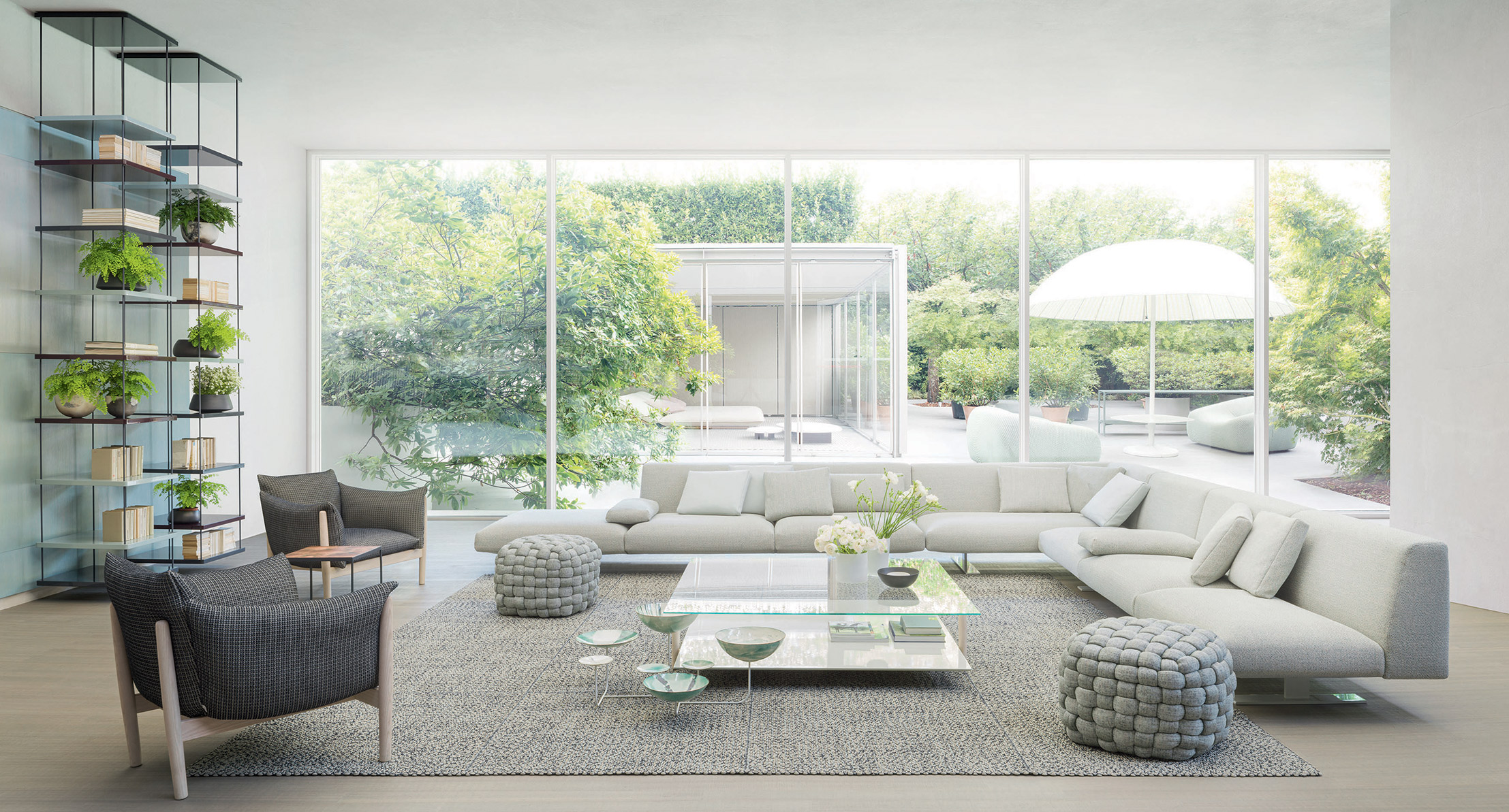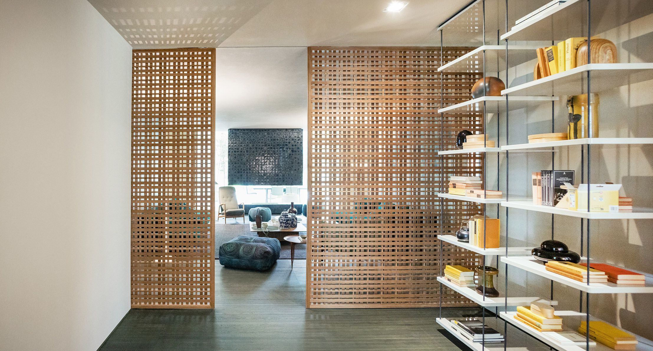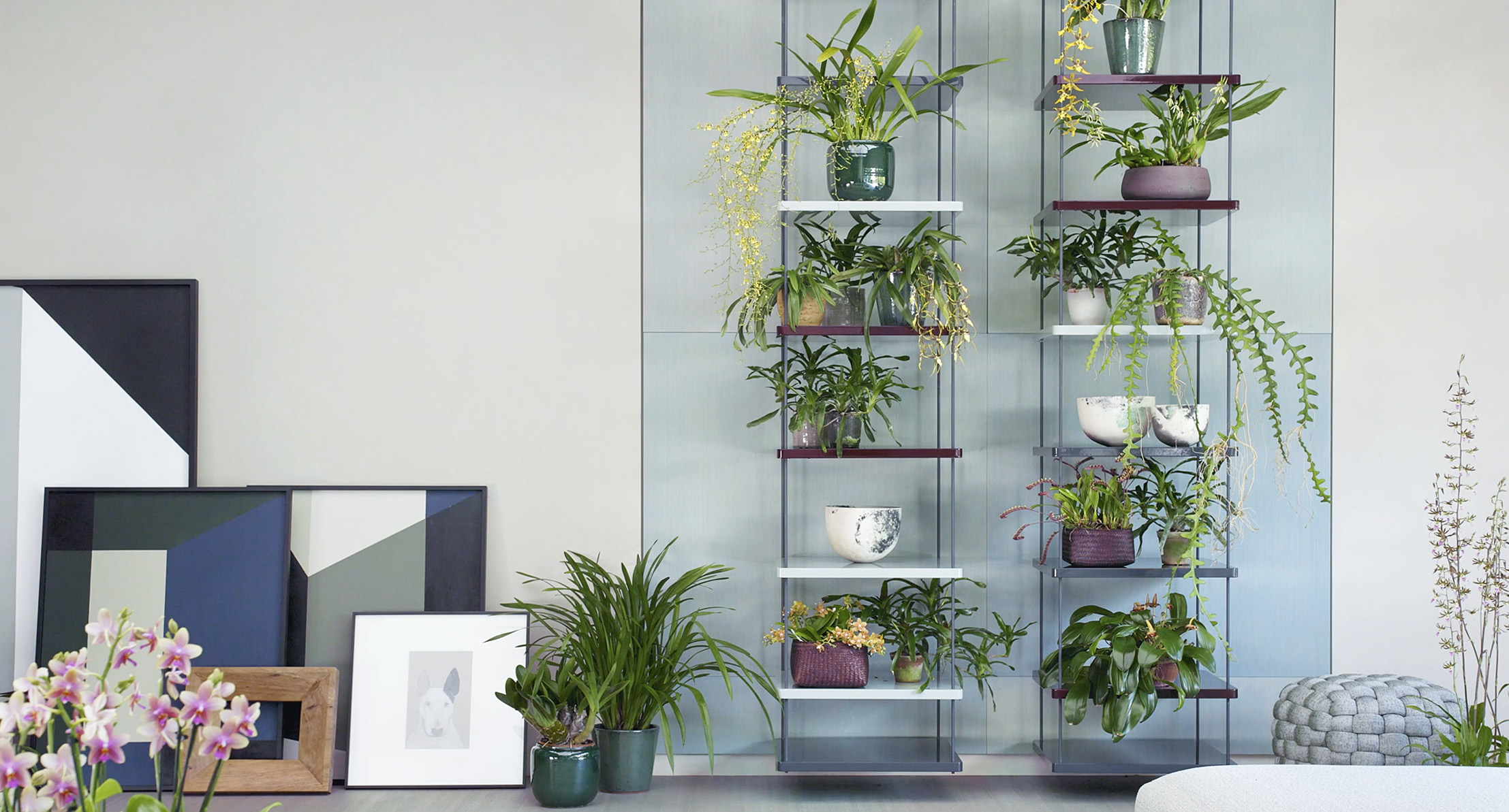 Libreria sospesa formata da quattro supporti in acciaio a cui è possibile agganciare ripiani in legno nella posizione desiderata.