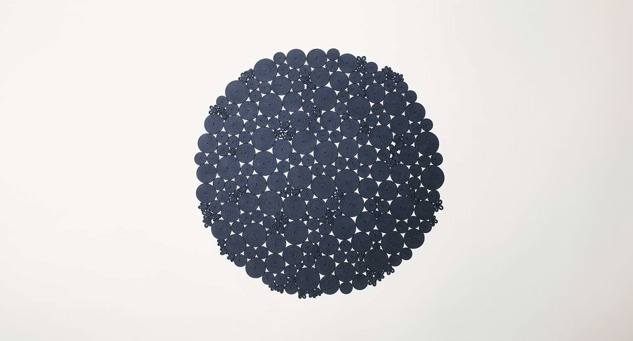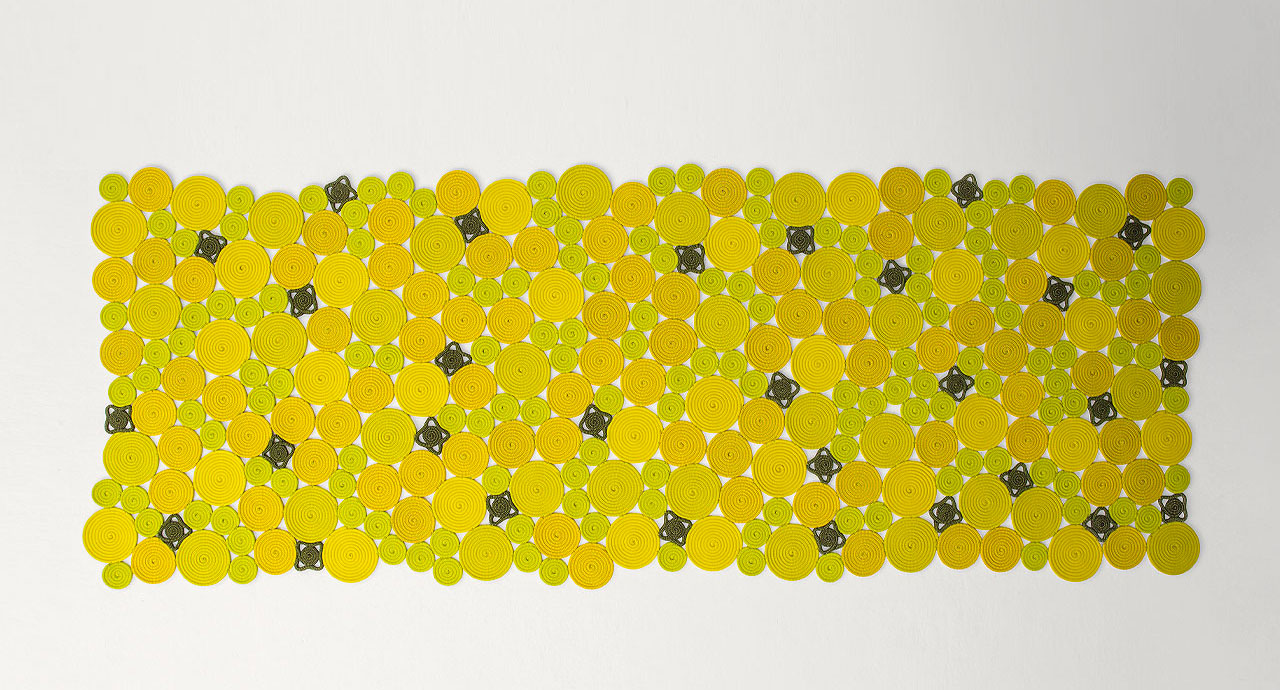 La corda è avvolta e cucita manualmente per formare spirali e decori stilizzati che uniti poi fra loro liberamente formano la superficie del tappeto.