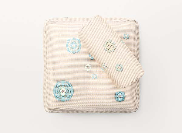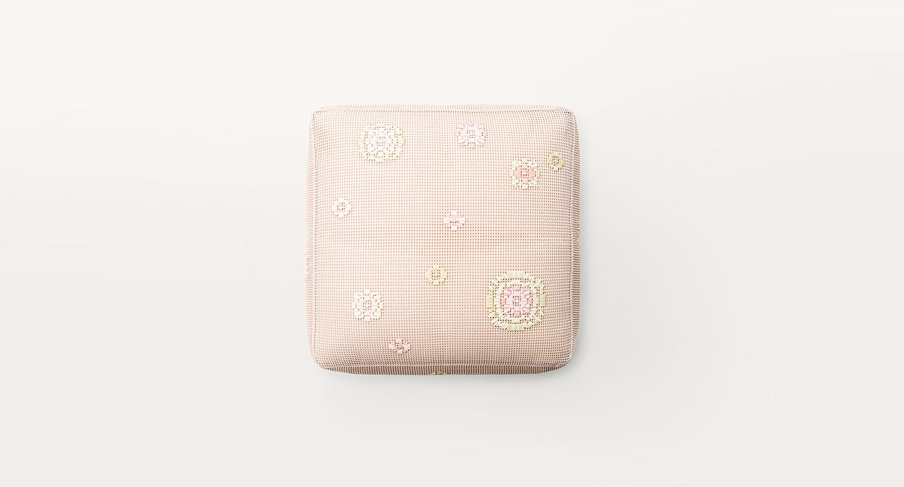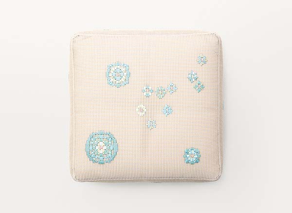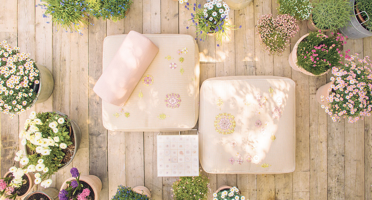 I decori floreali realizzati sul tessuto Kimia sono eseguiti a mano secondo schemi prestabiliti.