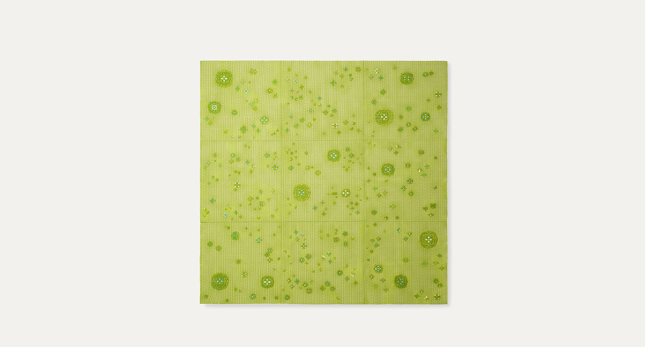 Spring è un tappeto modulare per esterni e interni con decorazione realizzata a mano.