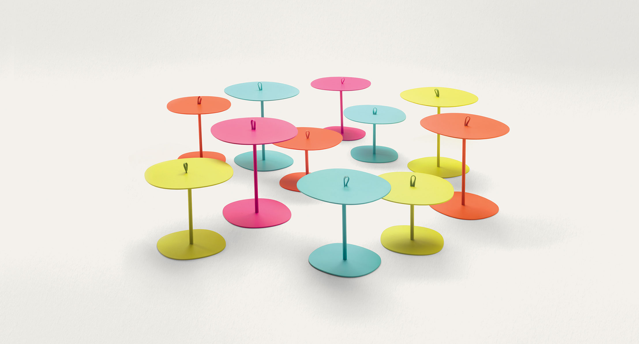 Serie di tavolini disponibili in diverse dimensioni. I tavolini possono essere completamente in alluminio, con o senza maniglia al centro del piano, o con piano in rame smaltato Esmal.