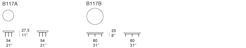 Serie di tavolini con piano circolare asportabile e utilizzabile come vassoio.