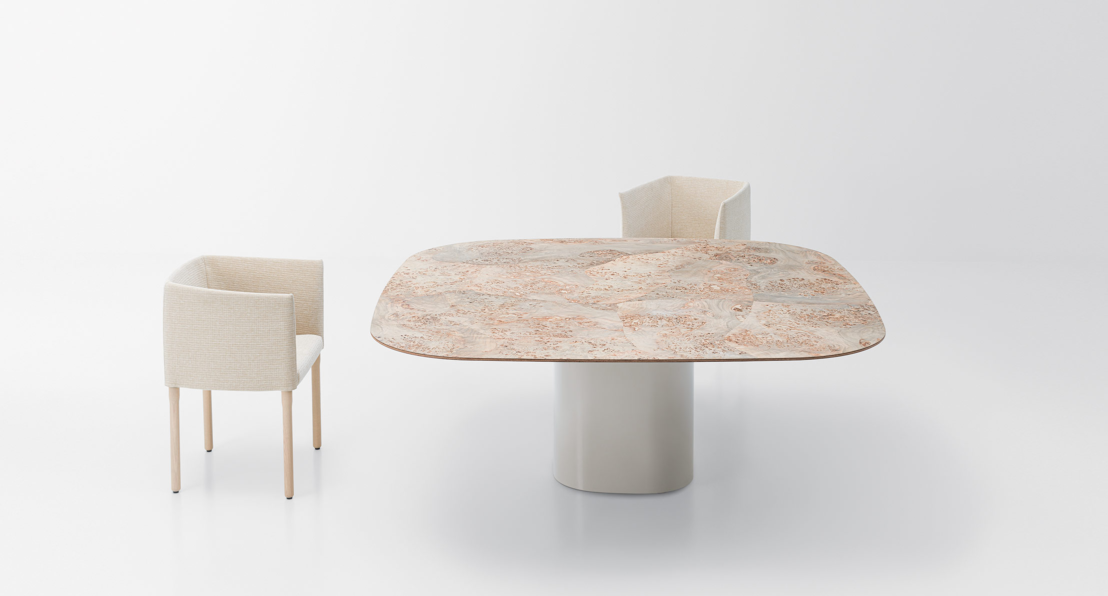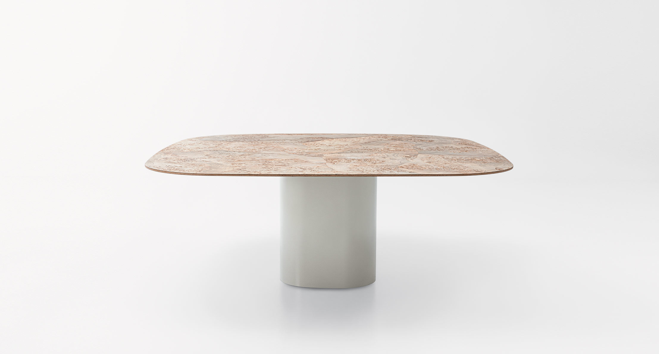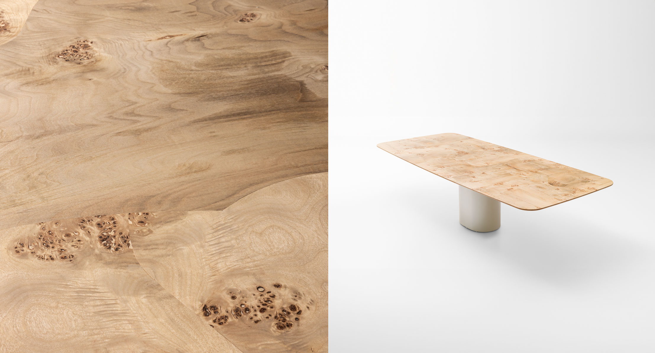 Piano: quadrato o rettangolare, raggiato su angoli e lati, in multistrato rivestito in frassino Abonos™ o radica di pioppo Abonos™.