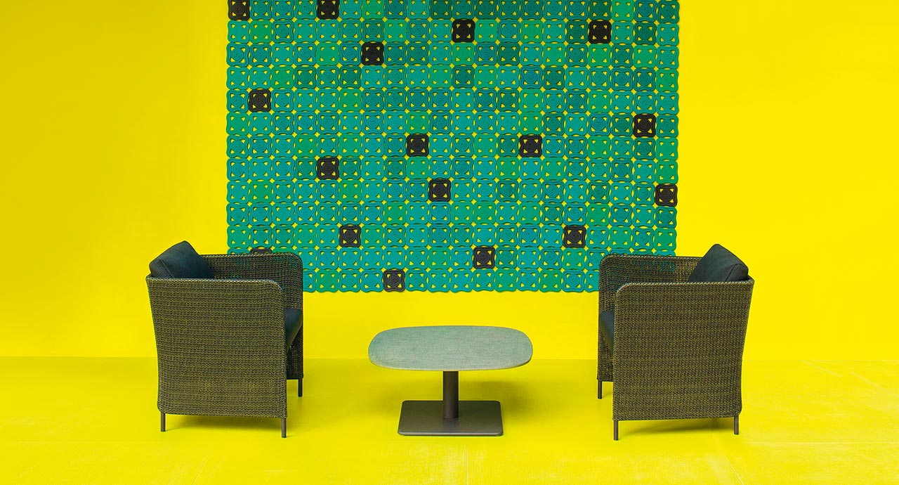 Cuscino di seduta: fisso, in fibra di poliestere riciclata e biodegradabile, inserto in poliuretano indeformabile, fodera in poliestere idrorepellente.
