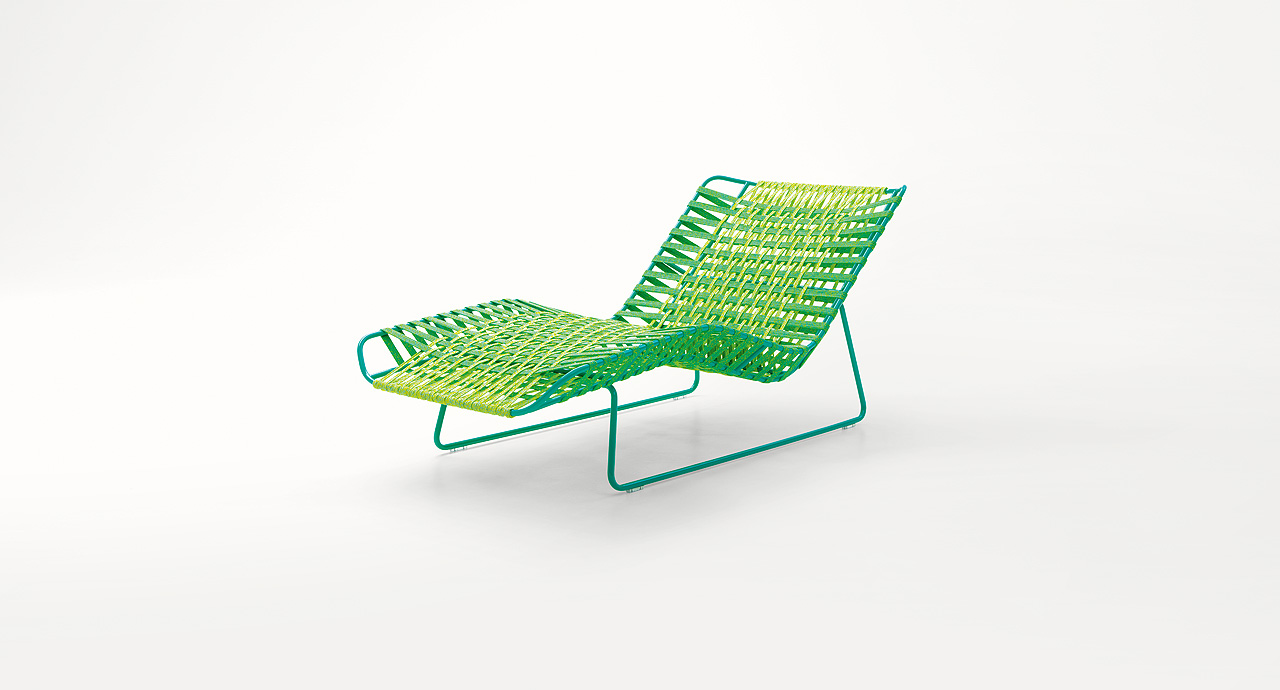 Chaise longue con rivestimento fisso intrecciato a mano sulla struttura.