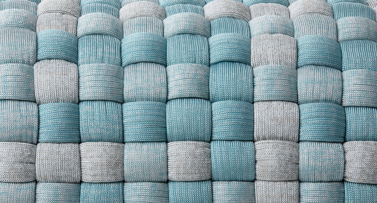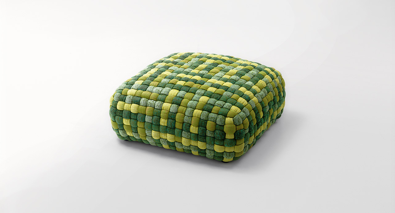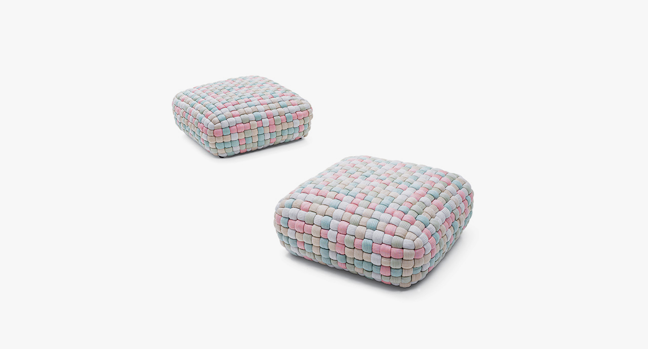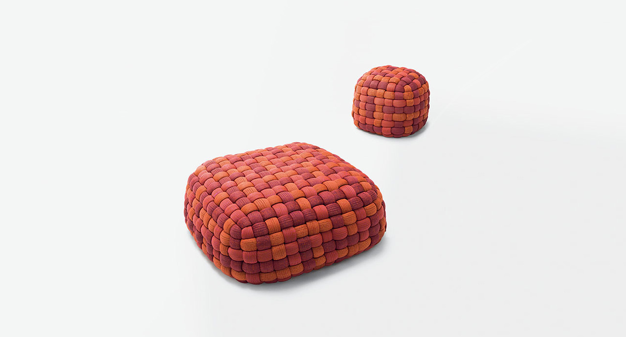 Serie di pouf disponibili in diverse dimensioni con rivestimento sfoderabile realizzato intrecciando a mano elementi in maglia tubolare.