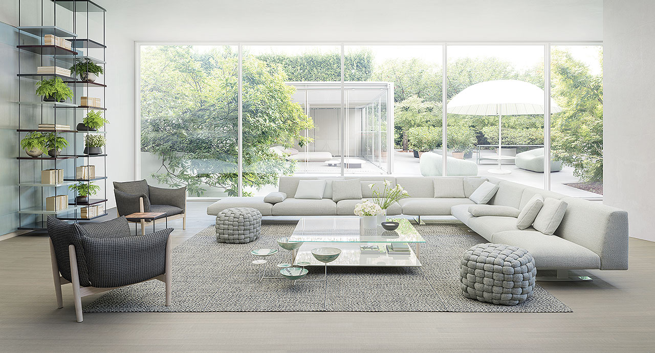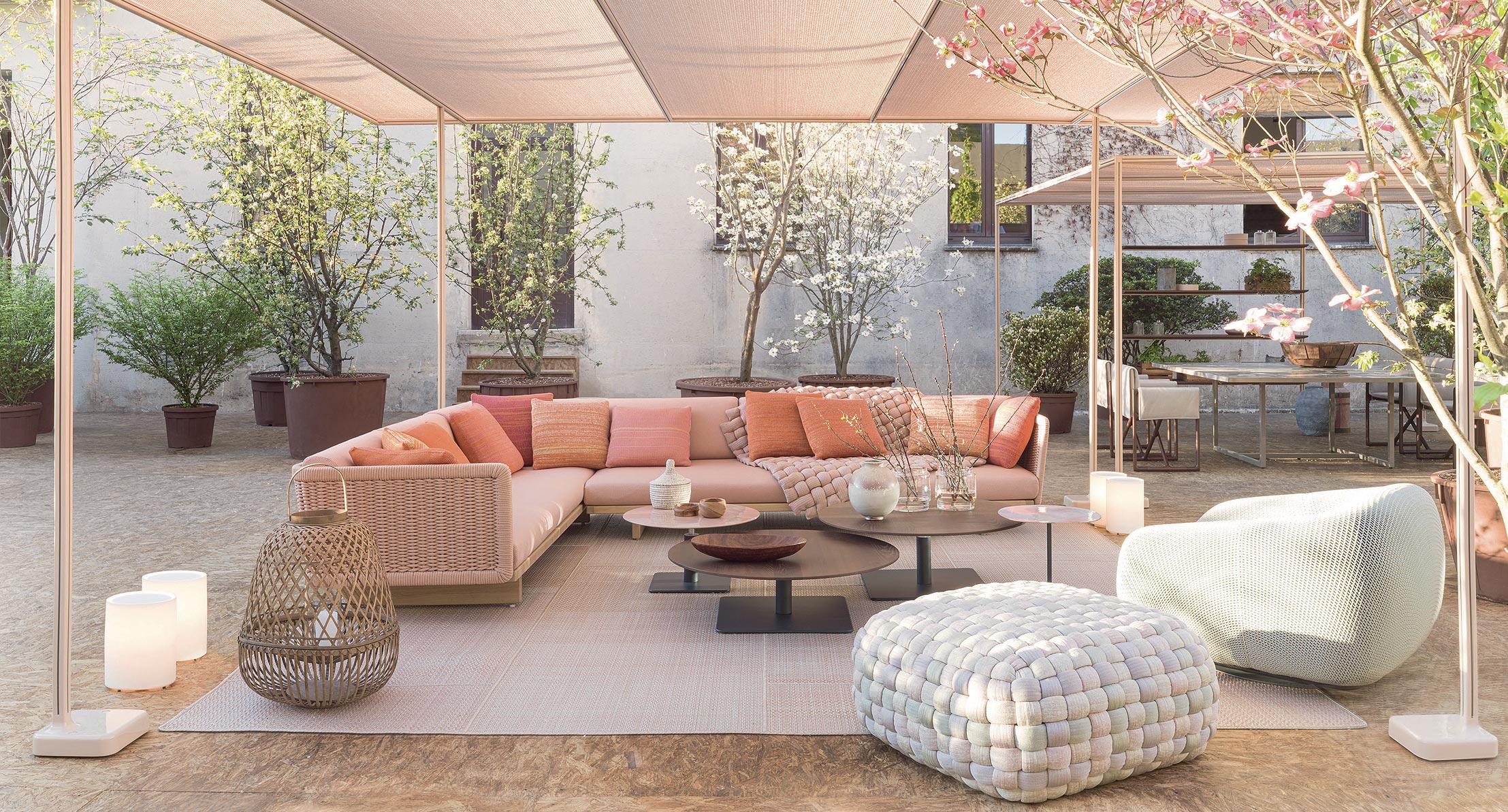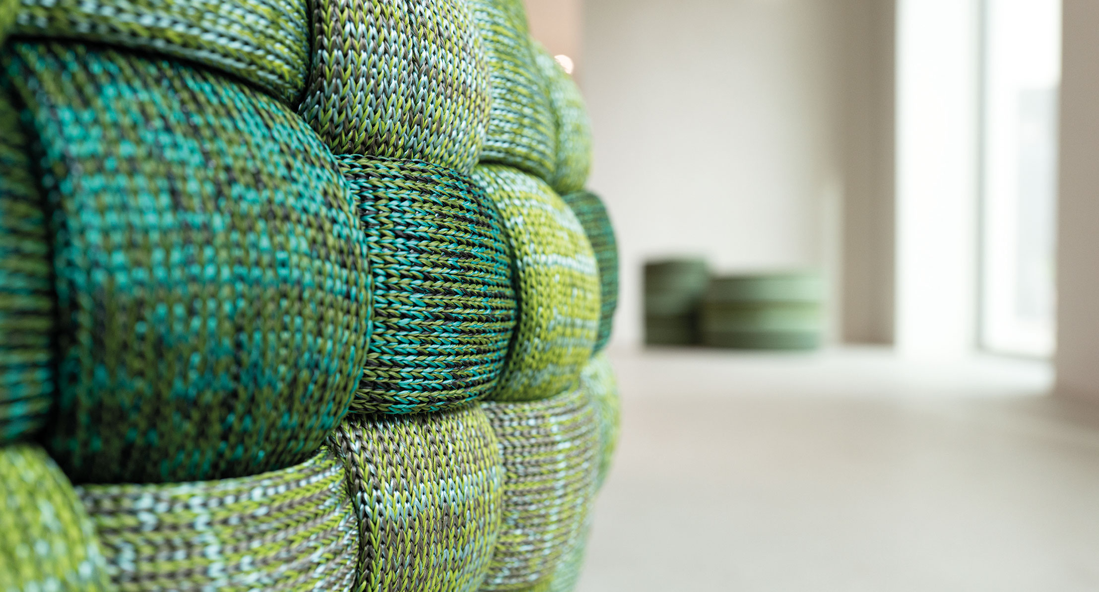 Serie di pouf disponibili in diverse dimensioni con rivestimento sfoderabile realizzato intrecciando a mano elementi in maglia tubolare.