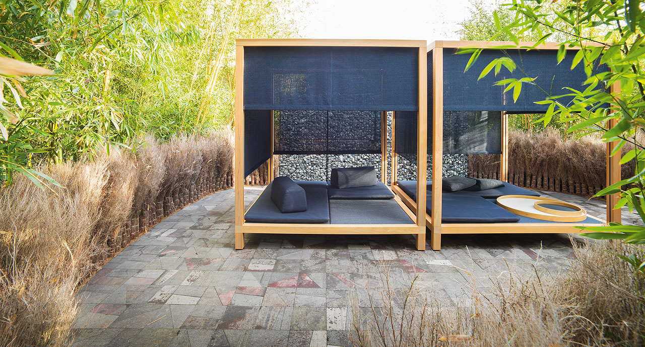 La serie Toku comprende anche un lettino, panche e tavolini con piani di seduta in legno o in tessuto e vassoi.
