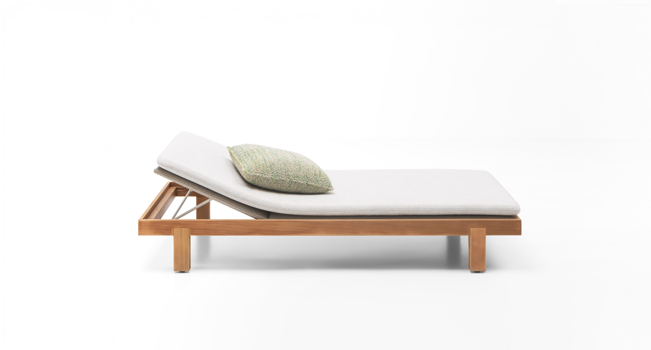 Lettino in legno con schienale regolabile manualmente in due posizioni oltre a quella di riposo.