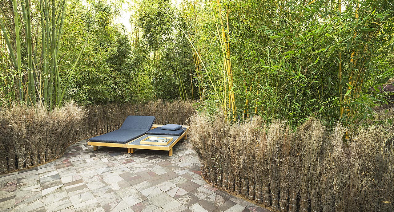La serie Toku comprende anche strutture ombreggianti in legno e tessuto disponibili in due dimensioni, panche e tavolini con piano di seduta in legno o in tessuto e vassoi.