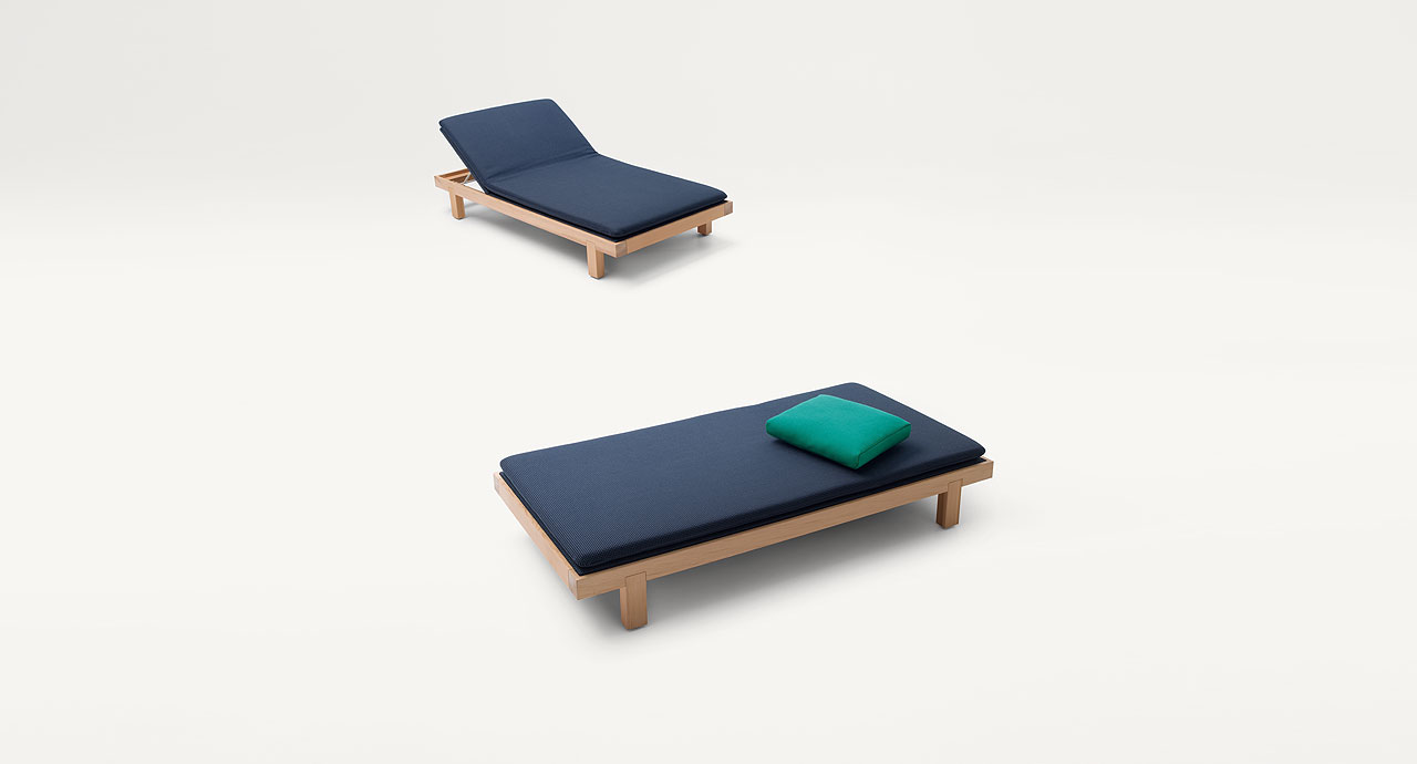 Rivestimento materassino e cuscino di appoggio: sfoderabile e disponibile nei tessuti outdoor indicati qui sotto.
