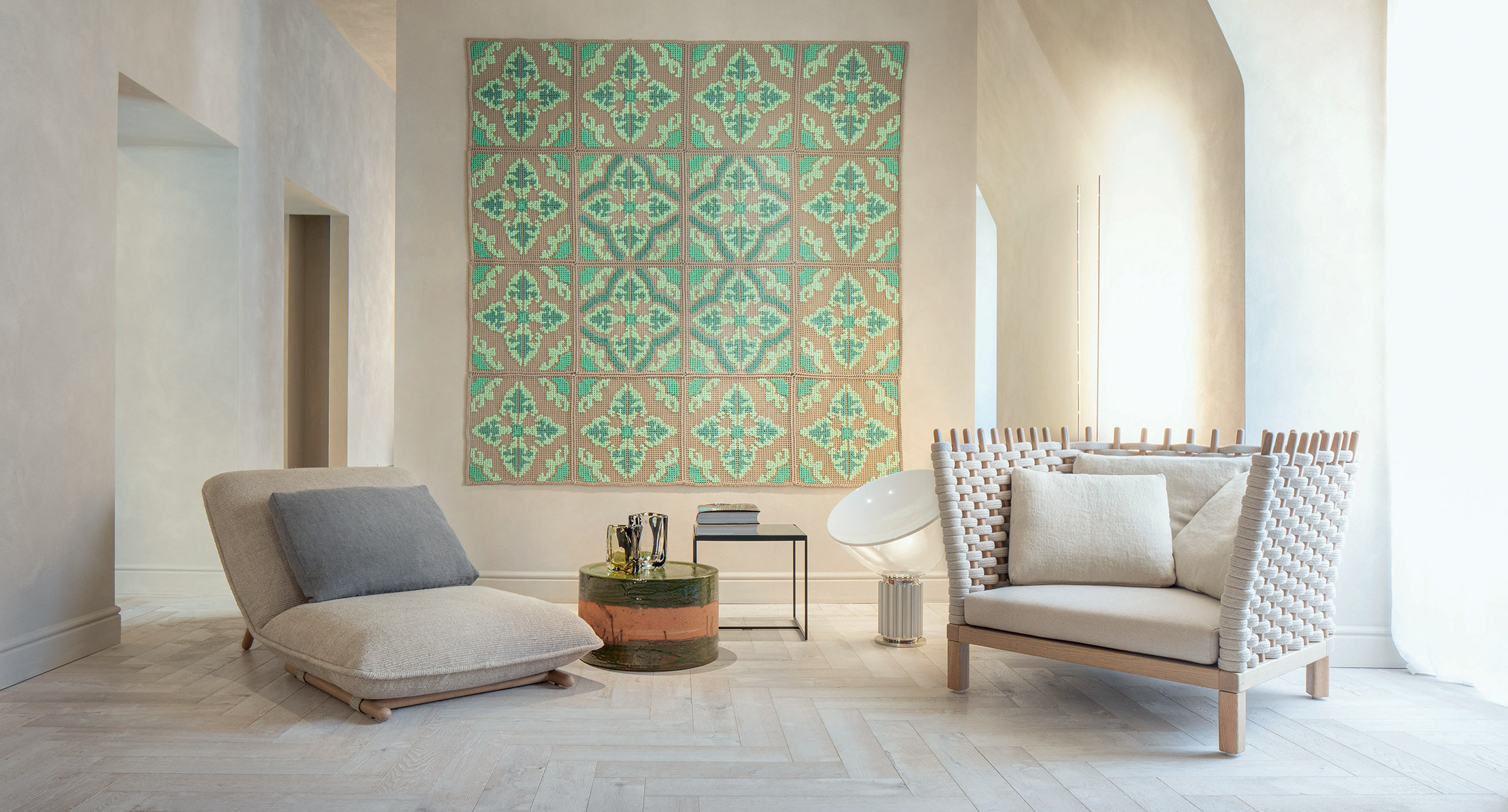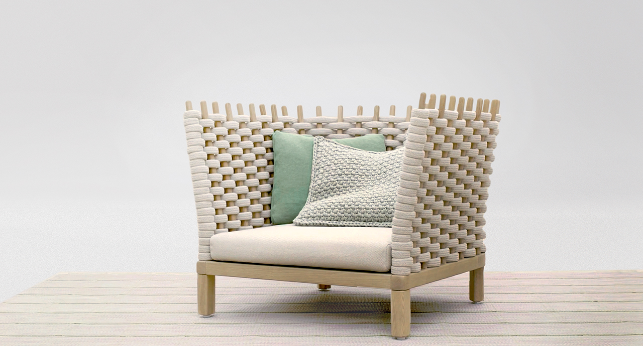 Serie composta da poltrona, divano e dondolo con rivestimento fisso intrecciato a mano sulla struttura.