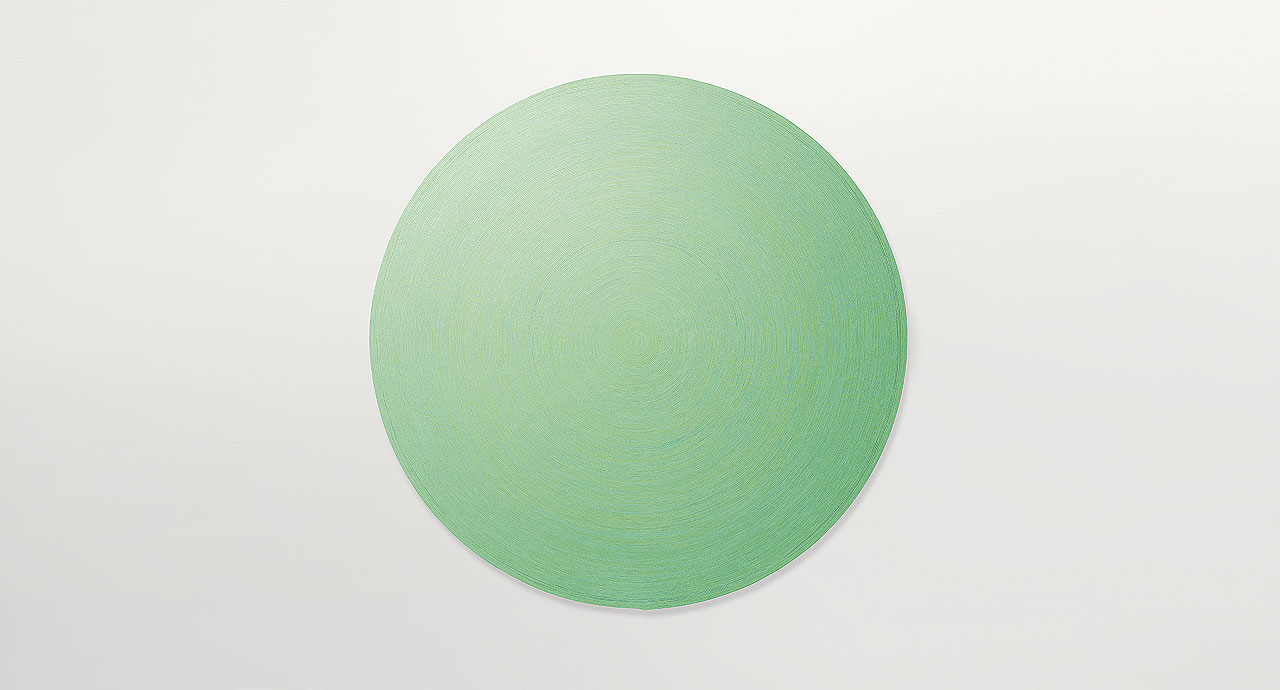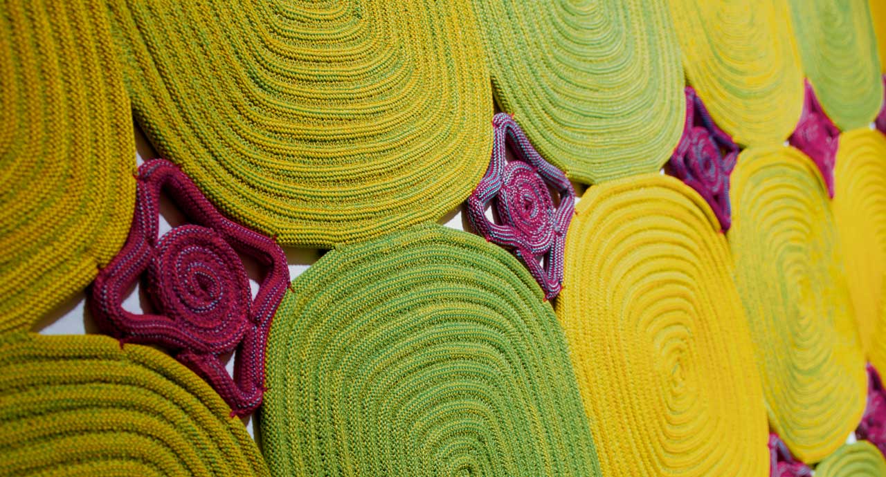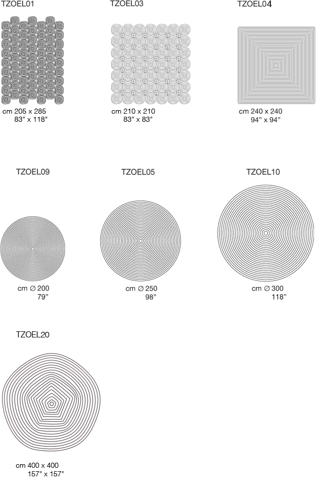 La superficie del tappeto è costituita da un unico grande elemento tondo, quadrato o pentagonale, realizzato cucendo a spirale la corda in lana.